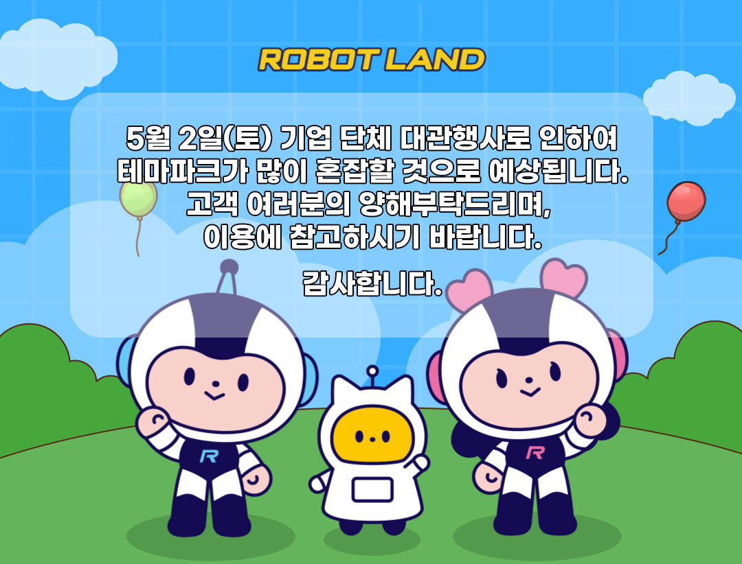 36개월 미만 이용시 무료로 로봇랜드 입장 및 놀이 기구 이용 가능합니다.